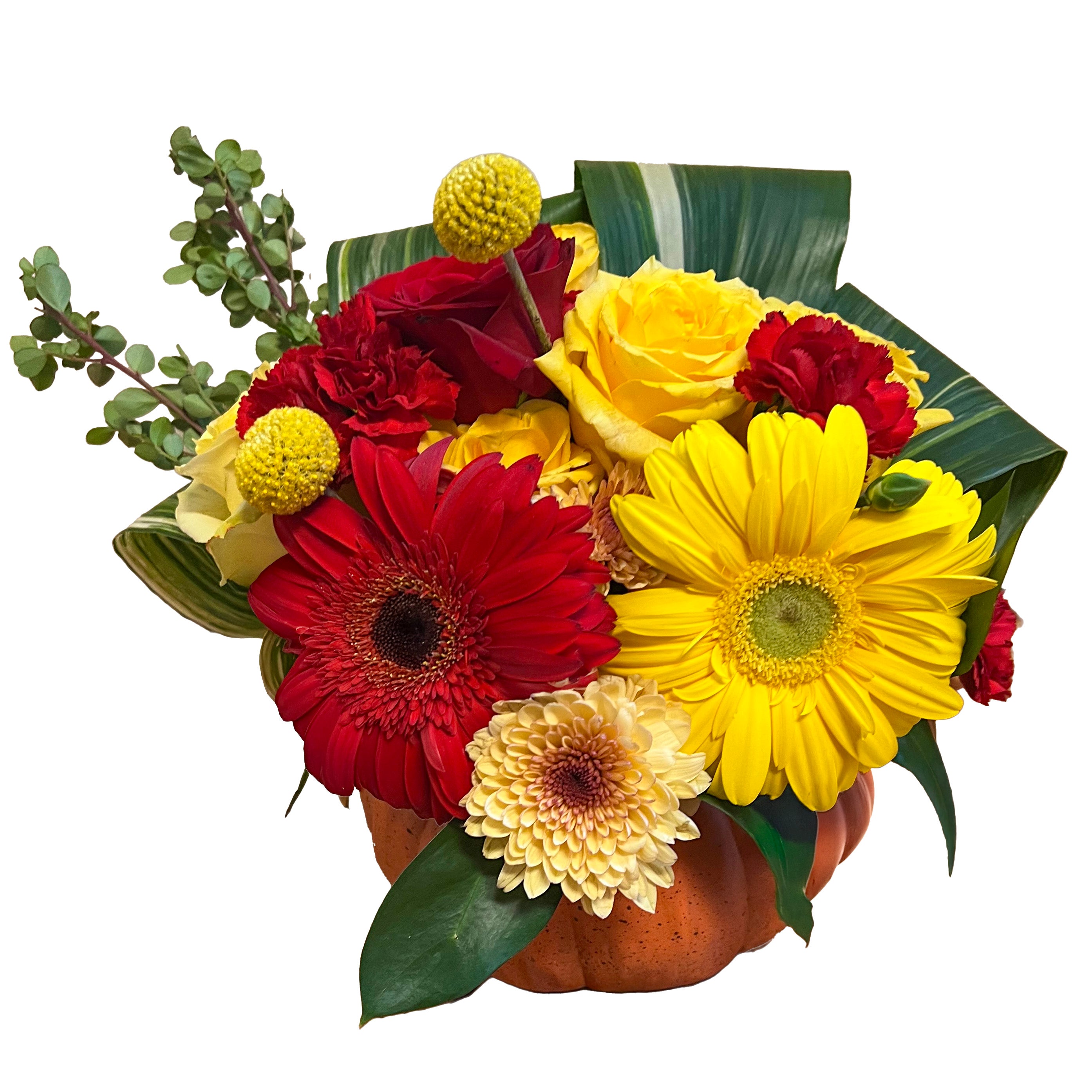 Bright red and yellow flowers fill this ceramic pumpkin with fall delight! The flowers may change, but the warm colors will not and who doesn't love a pumpkin full of flower for their table for Halloween or Thanksgiving (Approximately 6" tall and 7" across)!