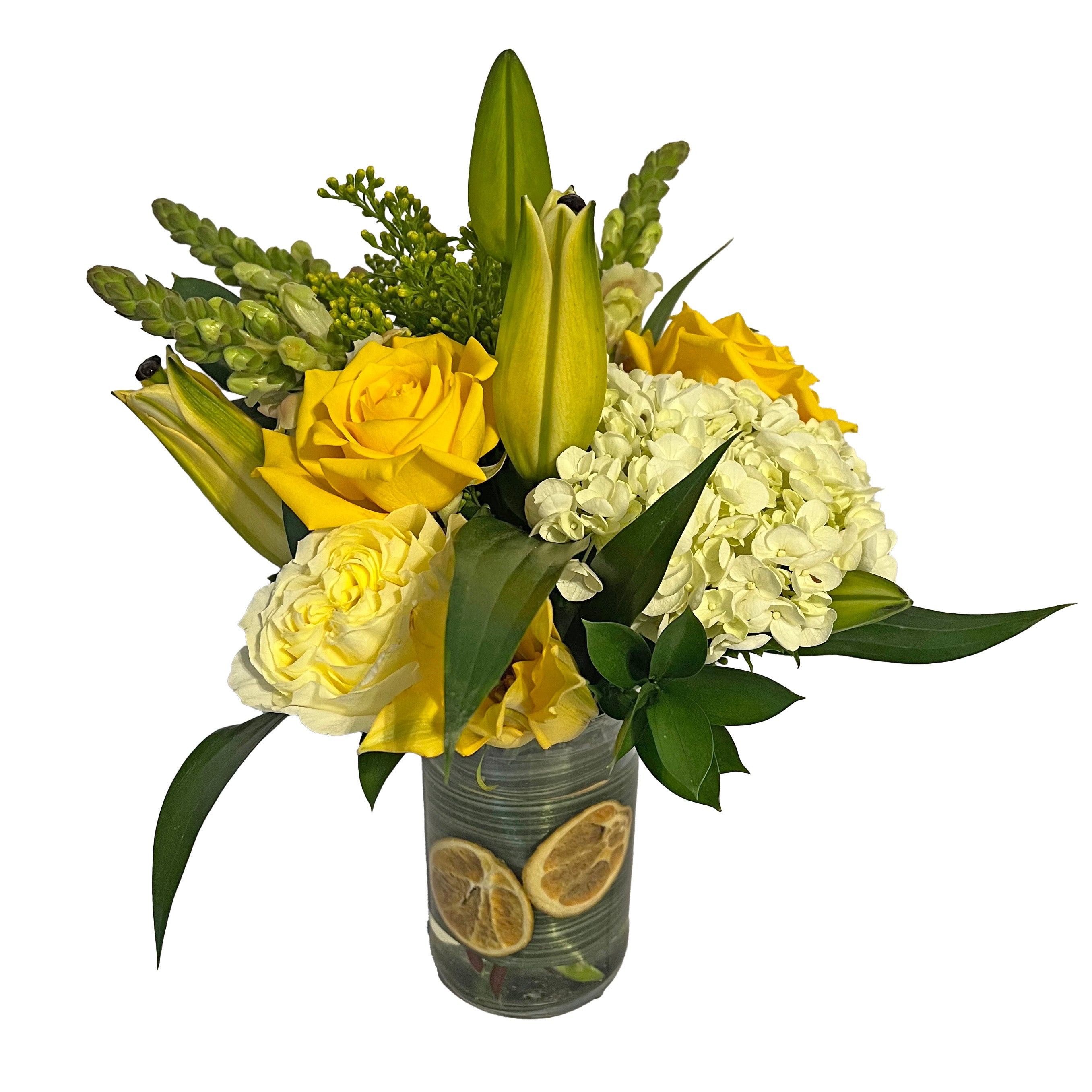 White and yellow seasonal flowers make this yellow bird cocktail a delightful arrangement year round (10'' tall and 8'' across).