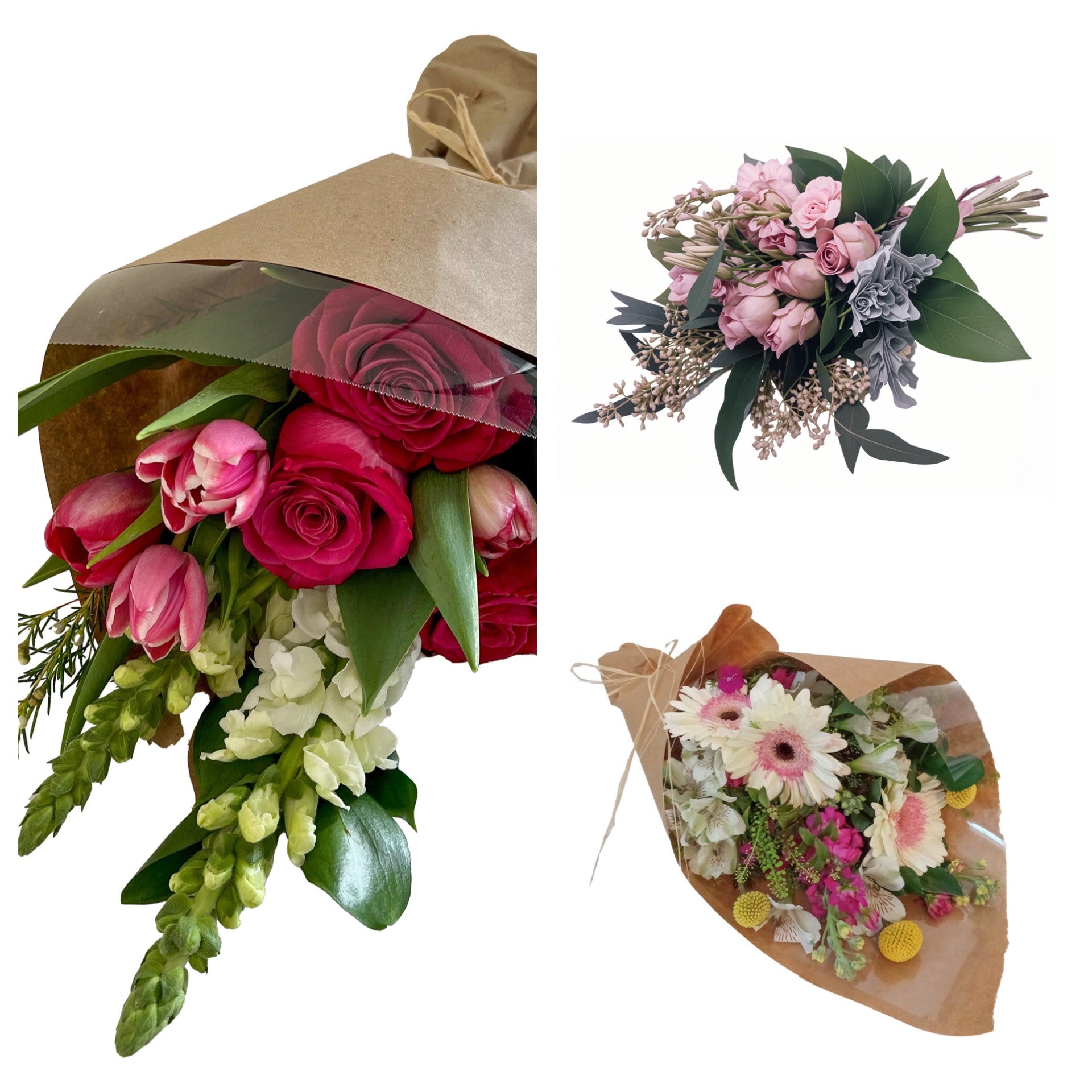 A beautiful hand-tied bouquet of soft pink seasonal flowers picked fresh especially for you. This bouquet will always have pink flowers in it but the type of flowers may change daily depending on availability.