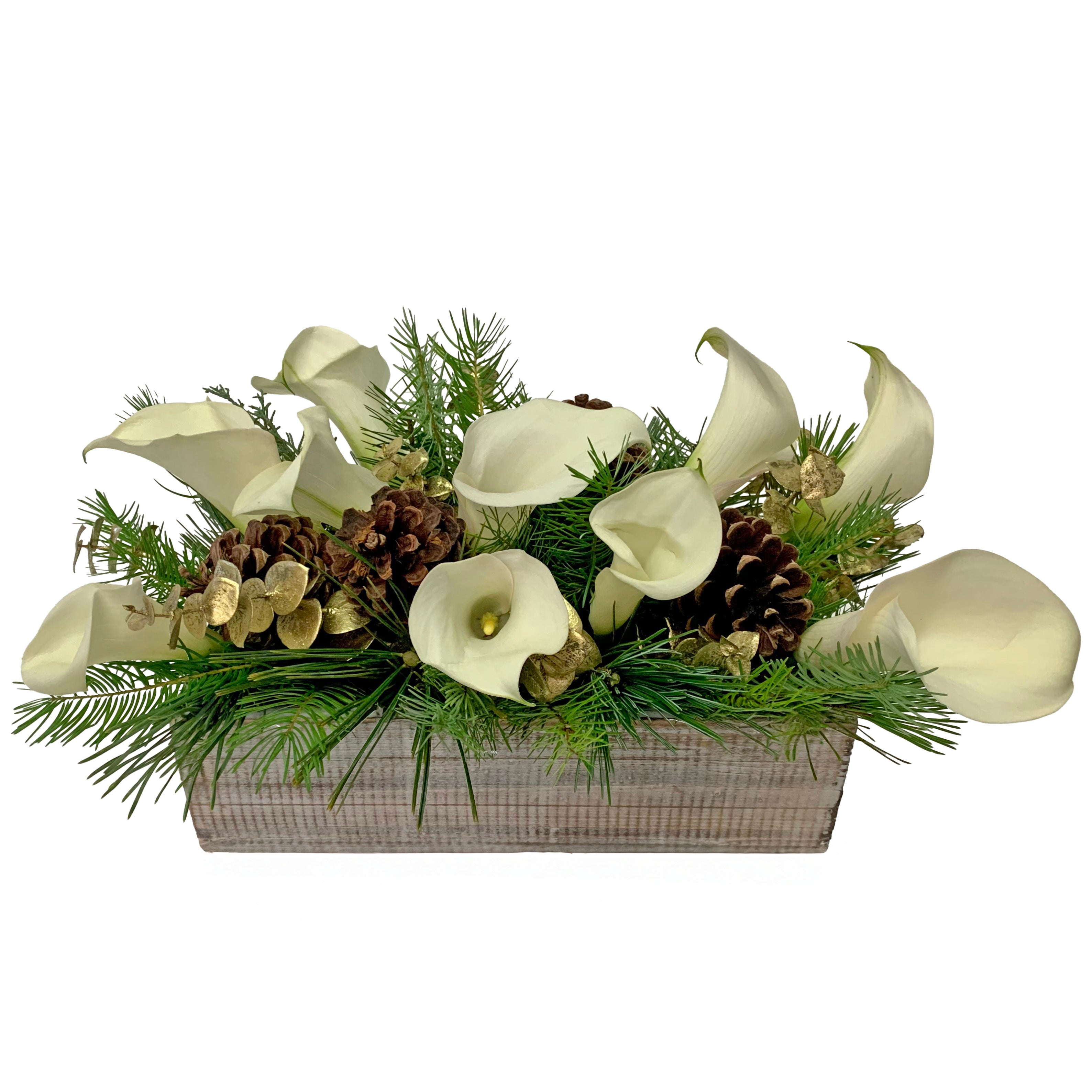 Think snow, warm fires and the smell the of pine! This elegant-looking centerpiece is full of White Calla Lilies, Pine Cones and Fresh Pine. It's a great gift or perfect for decorating your home this holiday season (8'' tall, 9'' across and 4" deep)!