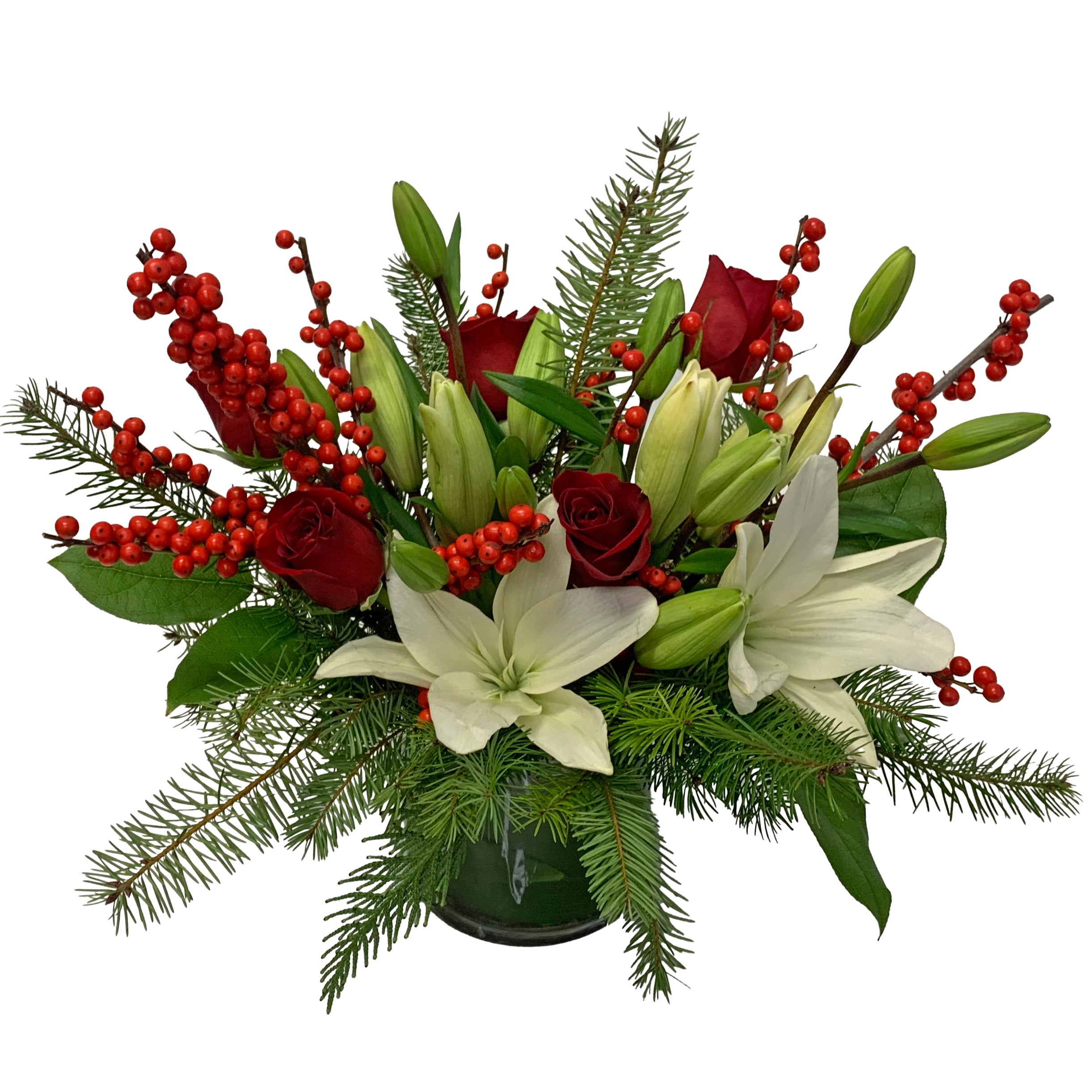 🕰️ Tradition speaks strongly through this holiday centerpiece of white lilies, red roses, ilex berries and Christmas greens. It's classic and smells like Christmas! (10'' tall and 10'' across)