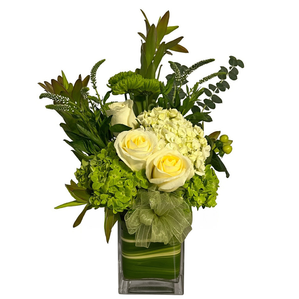 Classic white and green flowers including hydrangea, roses and varied greens make this elegant arrangement perfect for any occasion or decor (15'' tall and 8'' across)! Celebrate St. Patrick, send your sympathies, celebrate the Holidays or even simply add a beautiful touch of neutral floral to any room with this floral arrangement that includes a bow.