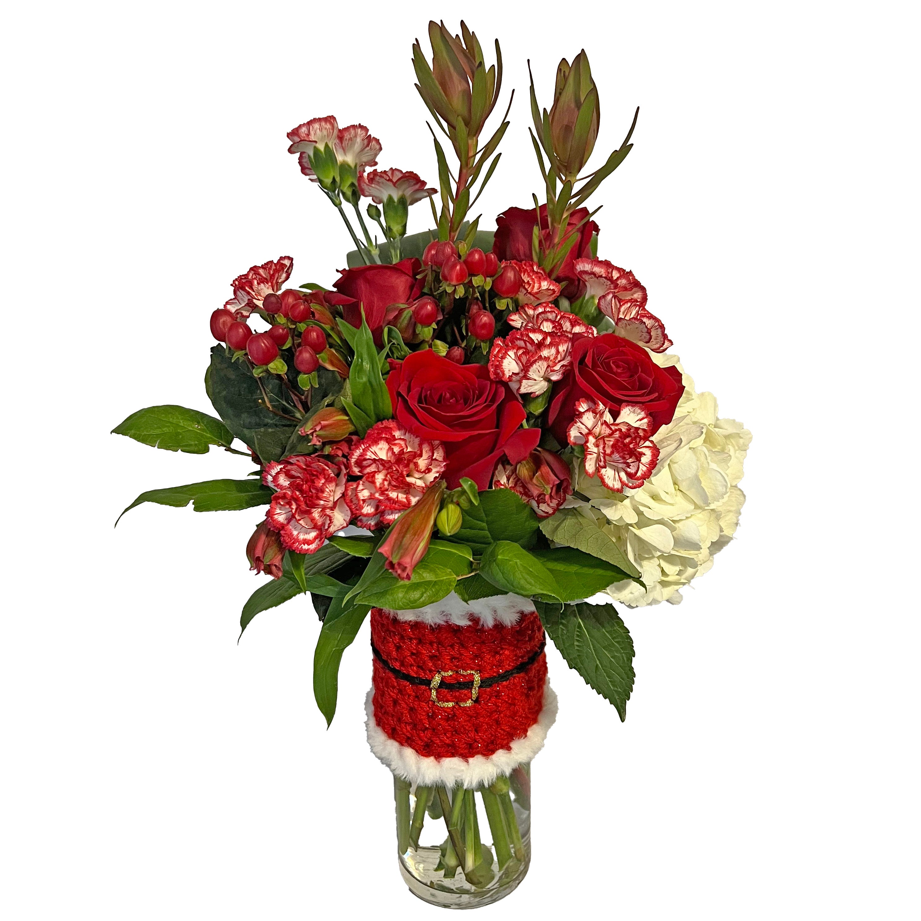 Santa's famous red coat with soft white fur adorns this vase of highly stylized red and white flowers perfect for the one you love this Christmas! The crocheted suit can be used as a mug or coffee warmer as well and won't be found at any other florist this Holiday Season (18" tall and 9" across)!