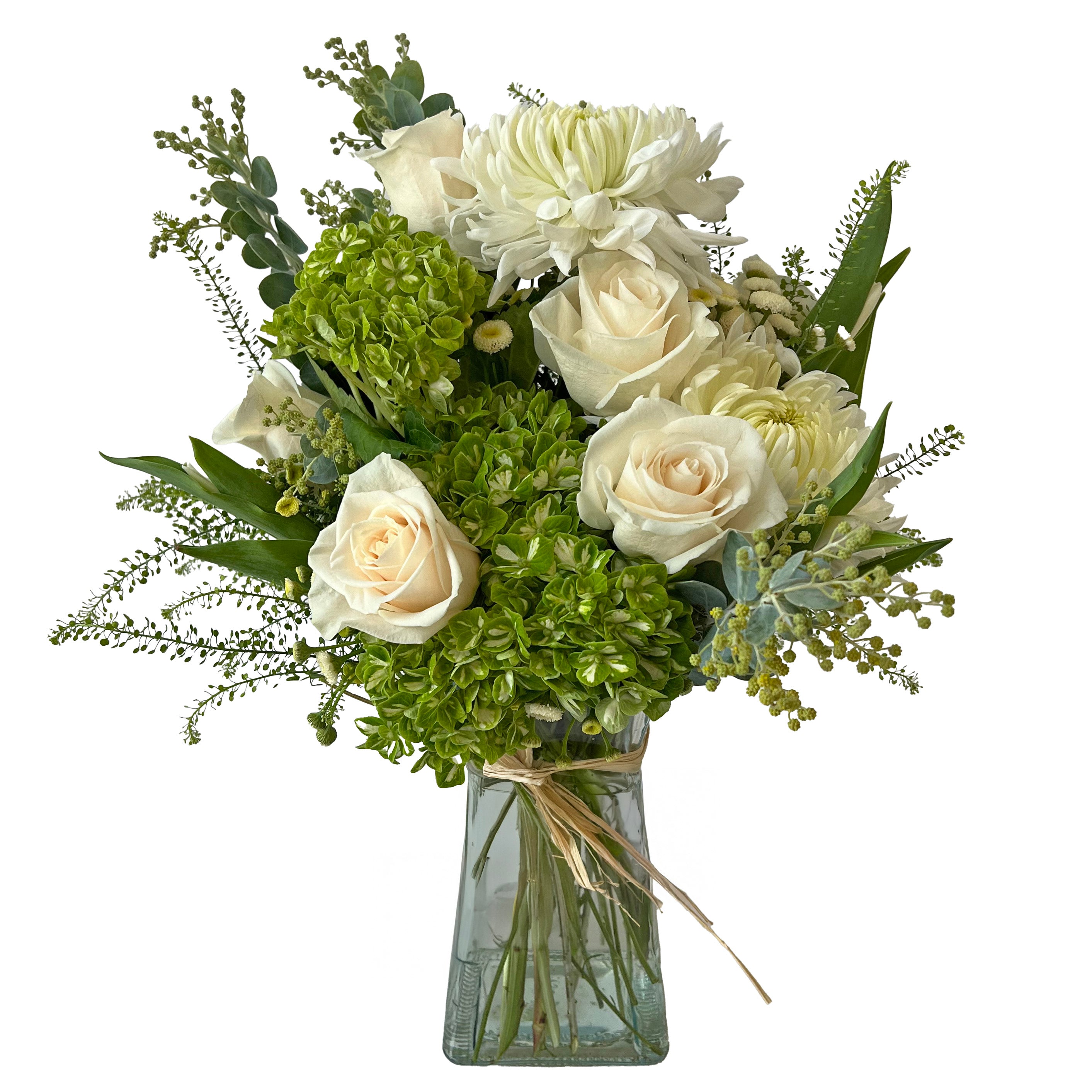 This lovely light arrangement of roses, mums and hydrangea flowers makes a perfectly neutral color palette that suits just about every decor and occasion. It's simple beauty is striking and delicate like the penny cress tucking around it (18'' tall and 10'' across)!
