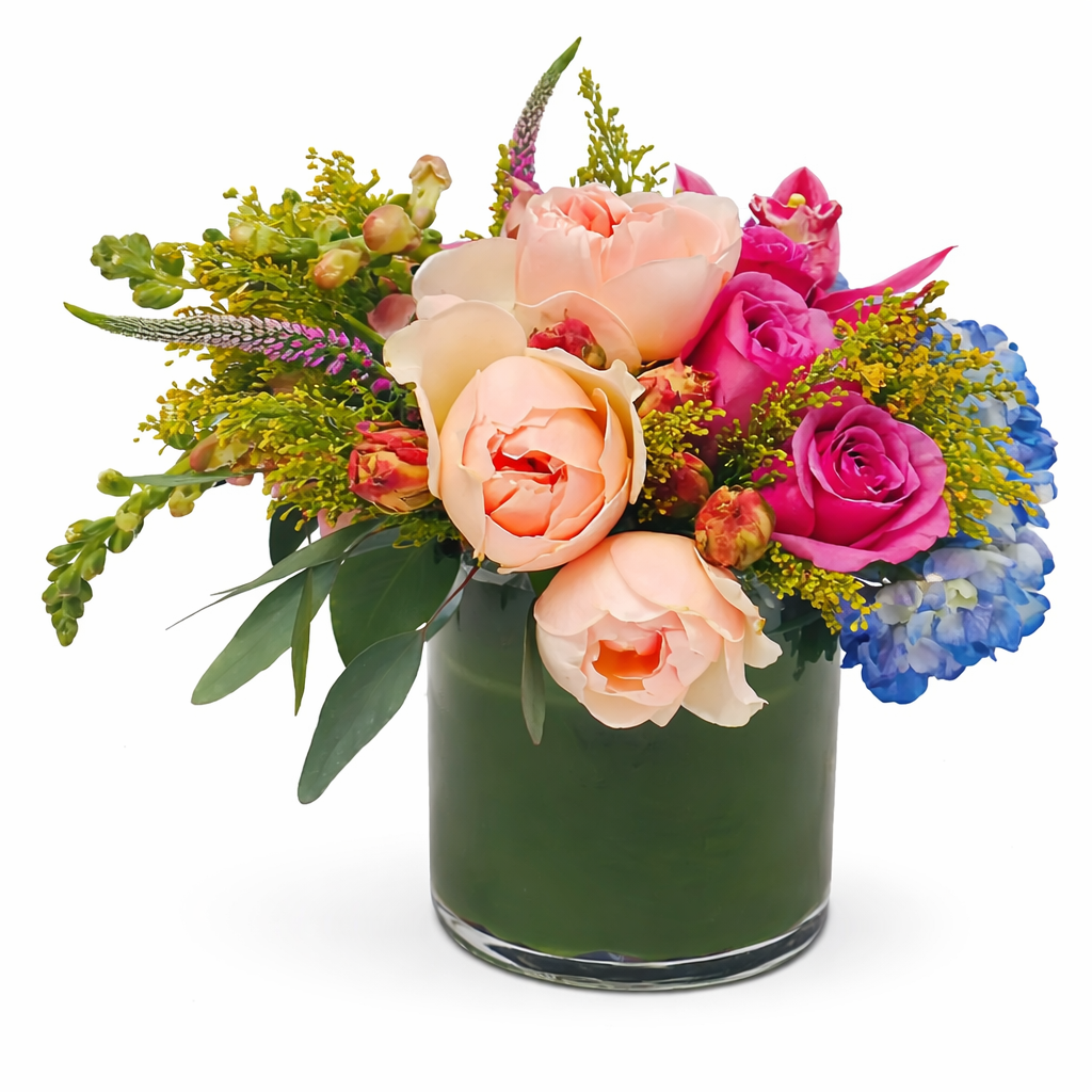Peach Garden Roses steal the show in this arrangement of flowers with glorious smells sure to make anyone's day better! Don't miss your opportunity to make the world a better place one flower at a time (Approximately 8'' tall and 8'' across)!