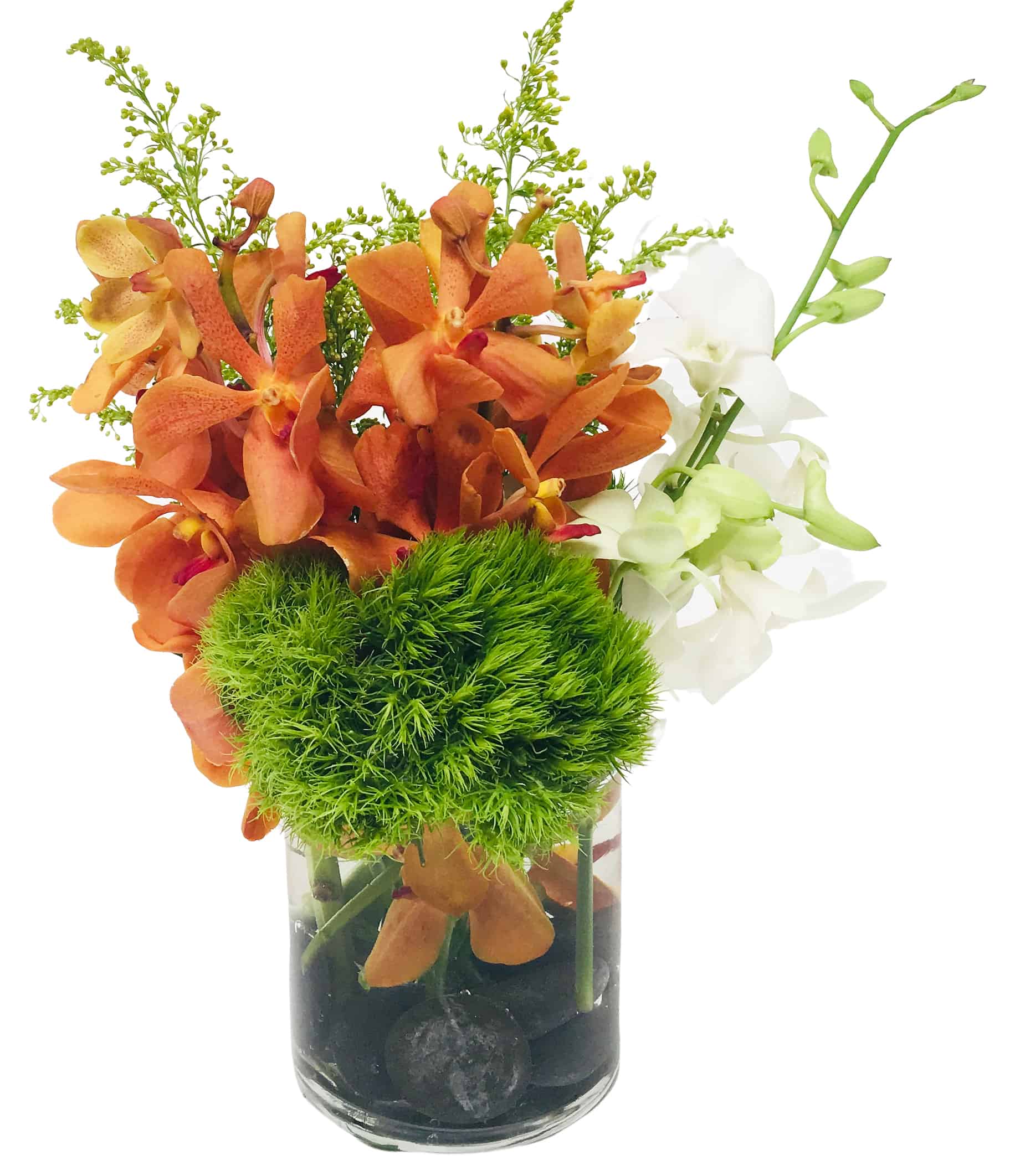 A warm burst of sunshine escapes from this floral arrangement of mokara and dendrobium orchids accented with green trick and solidago. It's sure to give and island feel to any room in your home or office (8'' tall and 4'' across)! Orchid types and colors may vary depending on what's available the day of your delivery.