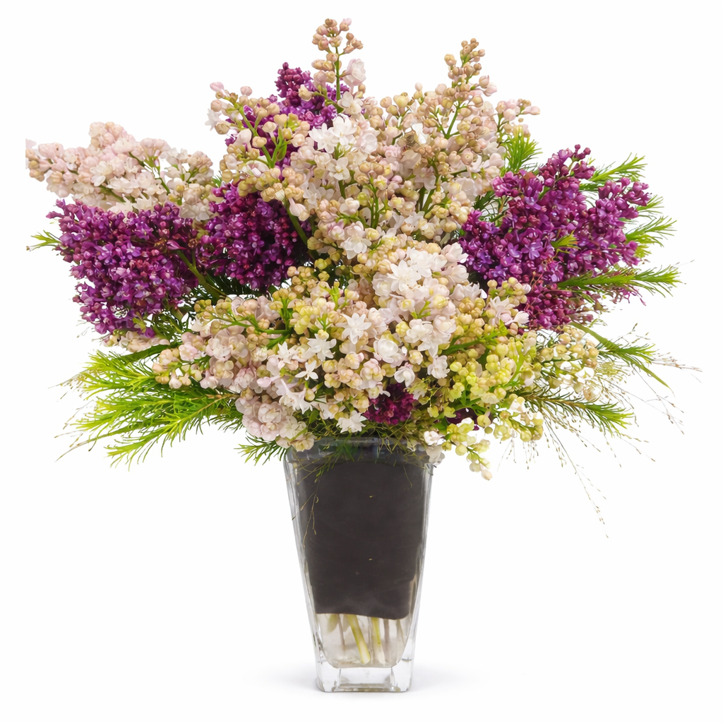 This beautiful arrangement of purple and white lilac that will fill your senses with the sweetest smell of spring! Lilacs don't last long, so be sure to enjoy a few days of heaven while you can (18'' tall and 10'' across)!