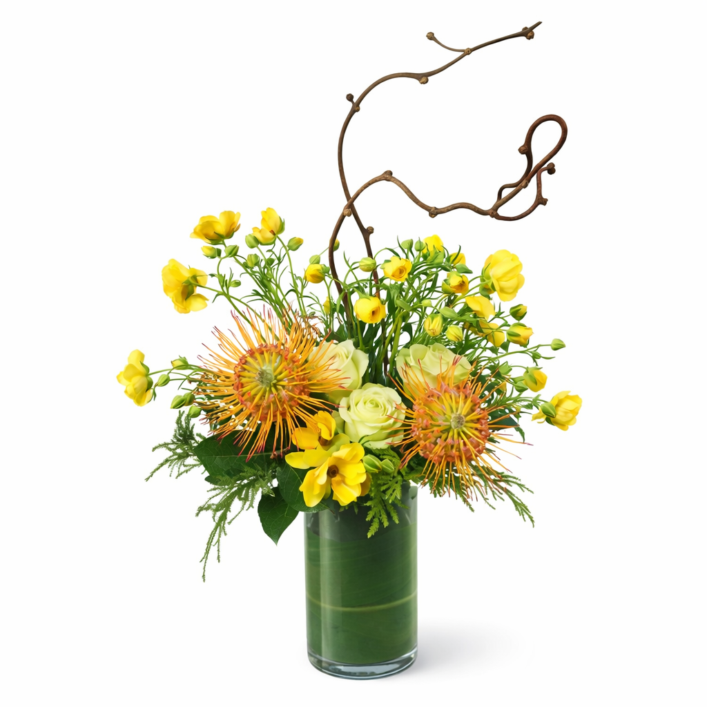 This tall masterpiece is comprised of gorgeous pincushions, roses, butterfly ranunculus and kiwi branches for a blast of sunshine anywhere it's needed (20'' tall and 12'' across).