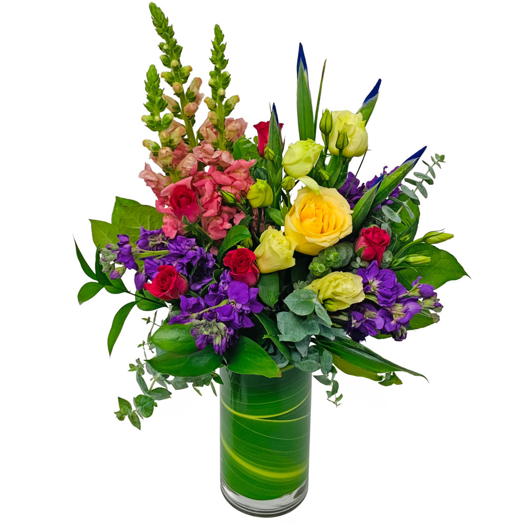This is a stunning arrangement of bright colored garden flowers sure to be the Bright Spot in anyone's Day when they receive it! It's also full of simple scents sure to make you smile bigger (16" tall and 12" across)!