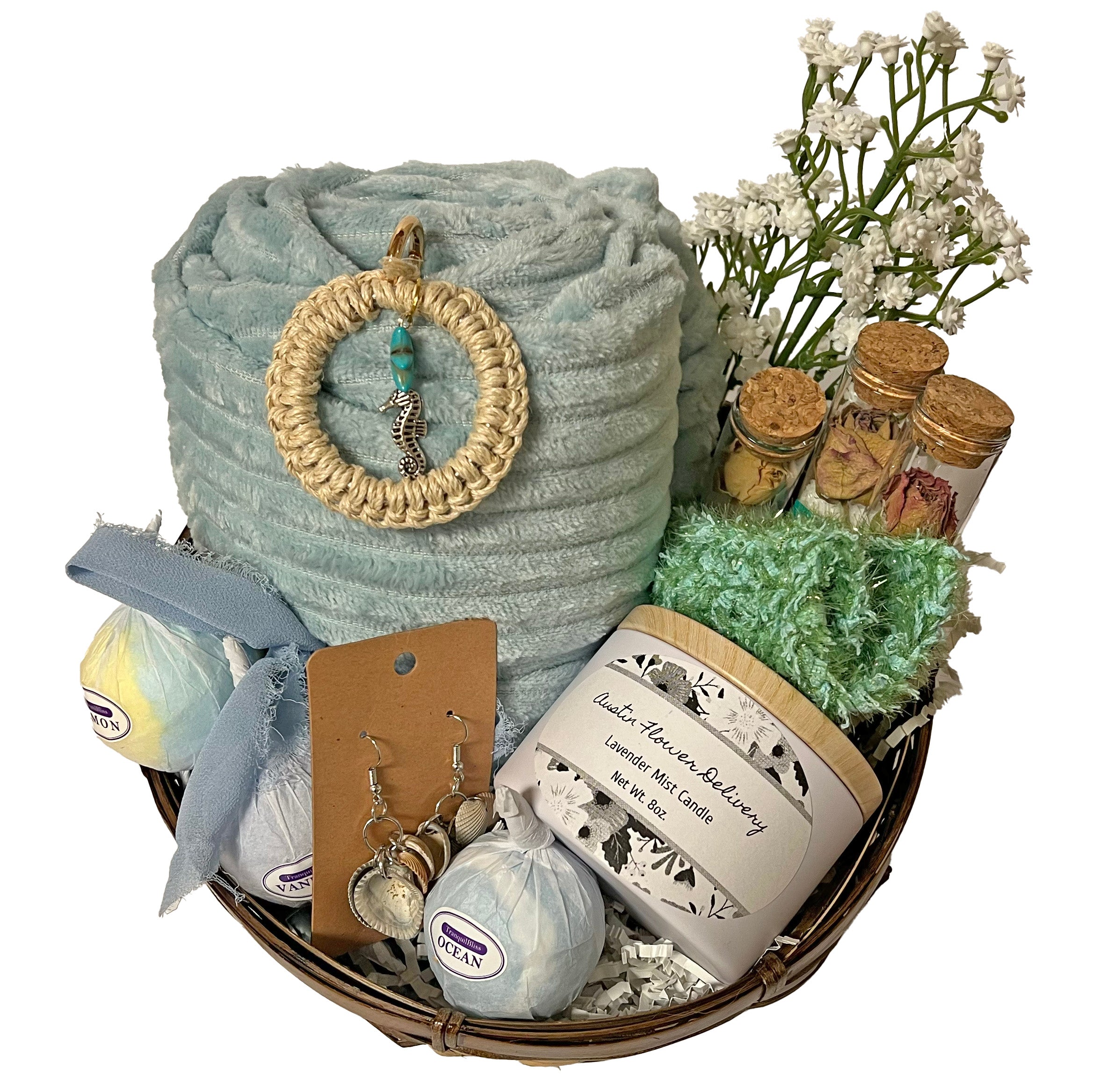 This is a unique Austin gift basket that you won't find anywhere else. It has a warm and cozy blue blanket, bath bombs, a Lavender candle, bath salts, a crocheted bath scrubby made to fit right over your hand or bar of soap, a sea horse keychain and some fabulous handmade seashell earrings that were sourced straight out of Galveston and made here in Austin! If you know someone who needs to relax and unwind this is the perfect gift and can easily be paired with one of our lovely flower arrangements! (Basket is 9" in diameter)