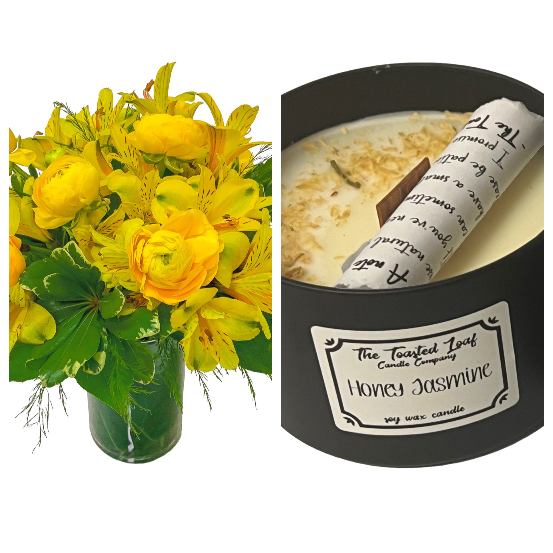 This amazing pair will bring sunshine, smiles and happy scents to your home! We paired our Sunshine in my pocket arrangement of bright yellow flowers with an 8oz Honey Jasmine Candle made by a 12 year old entrepreneur in Austin!