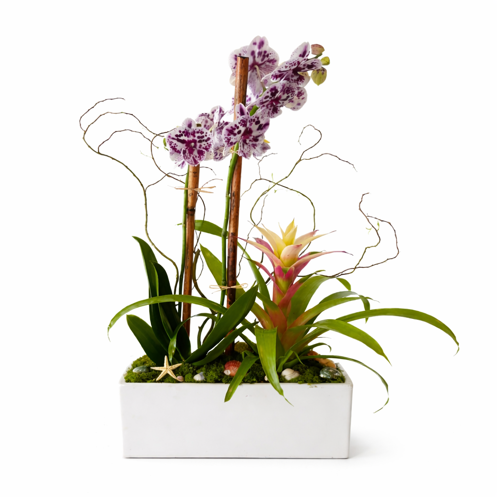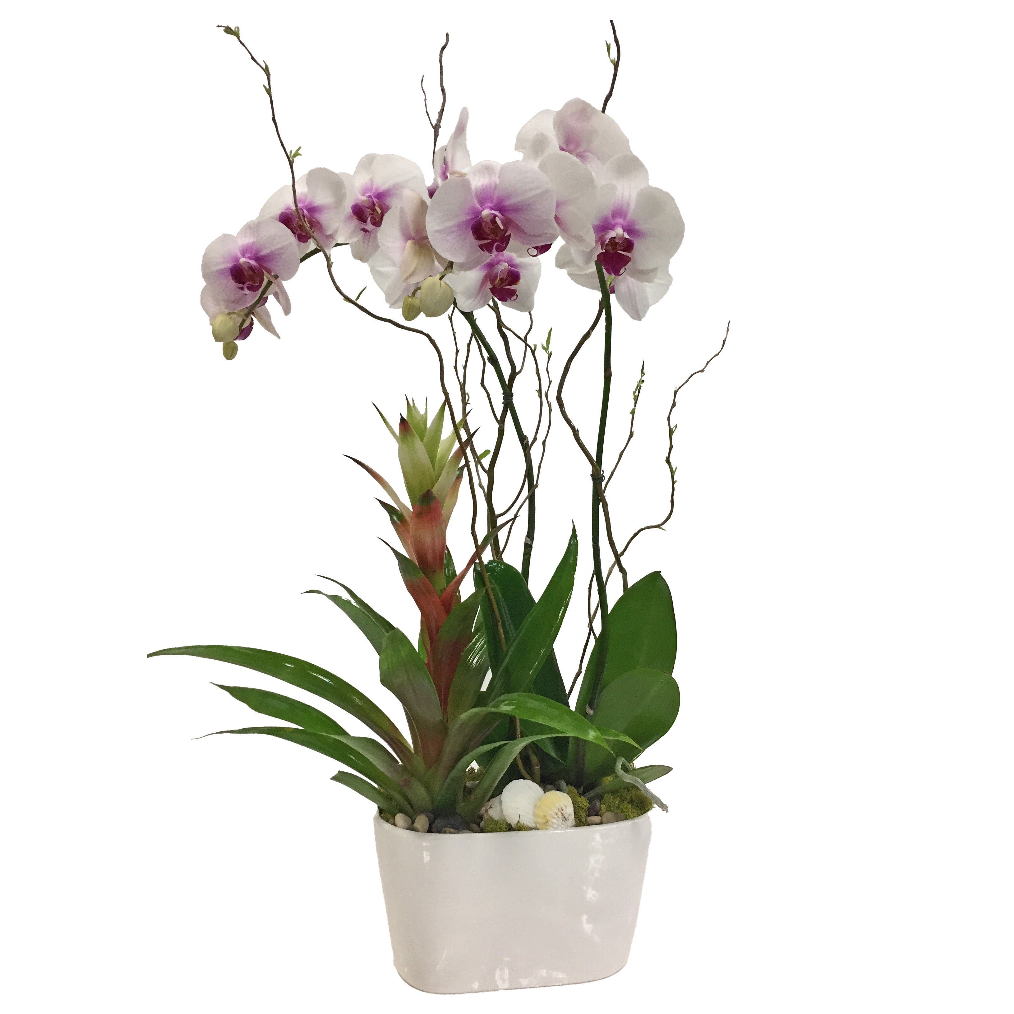 This beautiful double stemmed Phalaenopsis orchid is paired with a tropical bromeliad for a truly delightful planter. The vase will be ceramic but may vary in style depending on availability. We will do our best to replicate the colors pictured, but those are also subject to availability. (20" tall and 12" across) Please order at least one day in advance as we do not carry plants in the shop so you get the freshest ones possible.