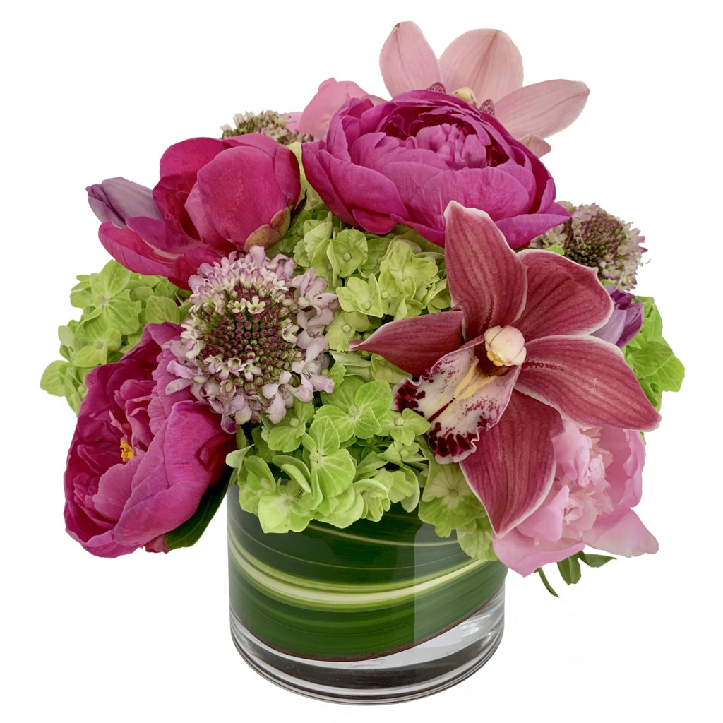 This gorgeous arrangement resembles a goddess with it's beautiful fuchsia peonies, mauve orchids, pink scabiosa, green hydrangea, and purple tulips. It's sure to make anyone feel special; like a goddess (8-9" tall and 9" across)!